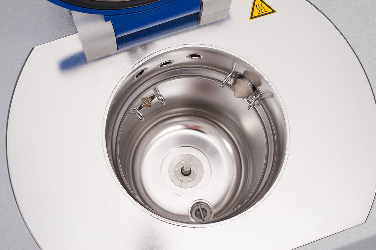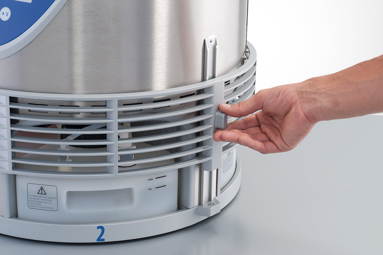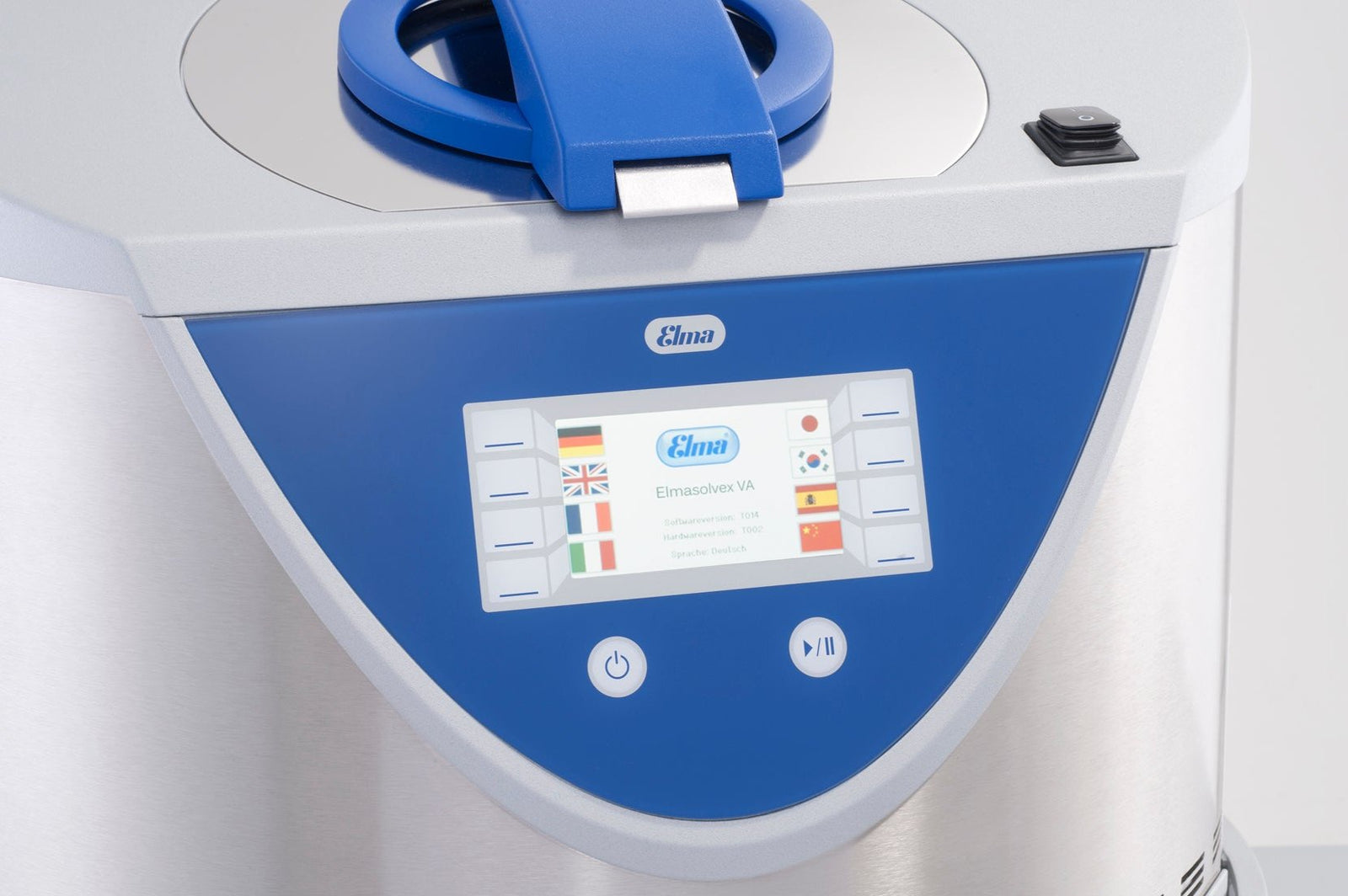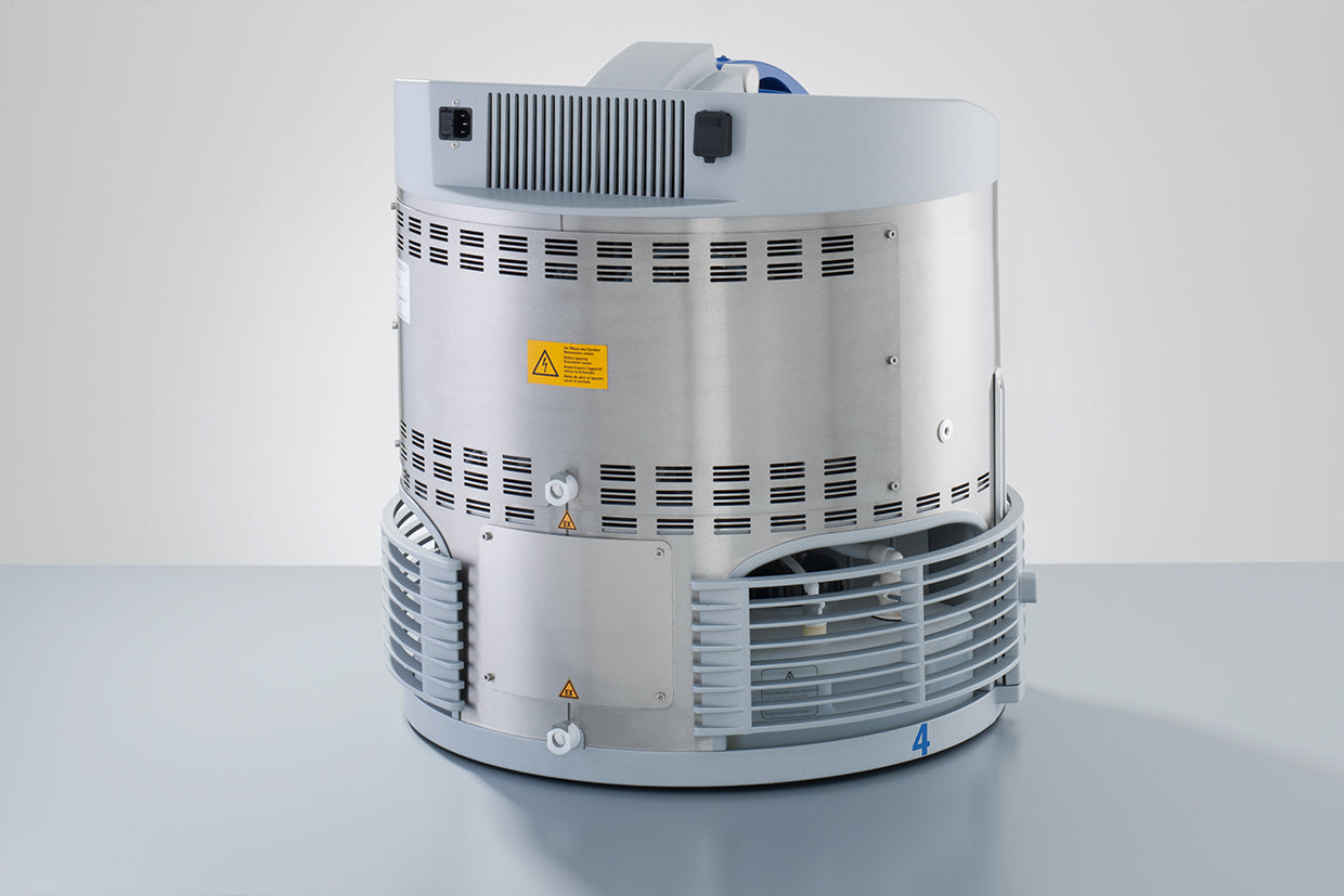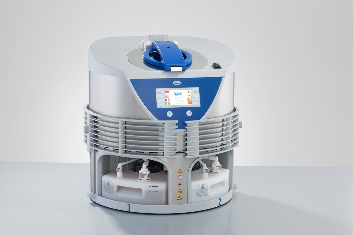 Multi-frequency ultrasound is adjustable from 80 kHz to 40 kHz for delicate parts. Place parts basket in the chamber - automatic pumping of solutions, ultrasonic cleaning, draining, and drying. Vacuum technology removes gas bubbles during ultrasound, allowing cleaning and rinsing to reach all surfaces. Purchase a filtration system (ELMA-VA1053376) to capture solvent vapors for units that cannot be exhausted outside.