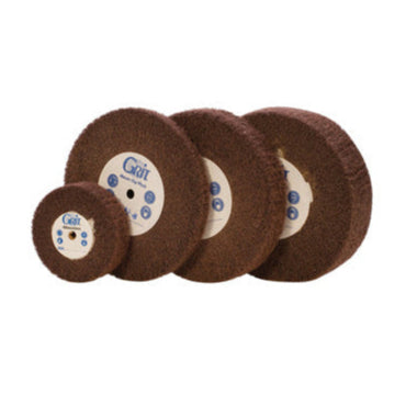 Satin finish buffs are non-woven abrasive wheels incorporating aluminum oxide and treated with a special resin. The red buffs are more aggressive, giving a satin finish to gold, silver, and other non-ferrous metals. All satin buffs have a 1/4" hole, perfect for tapered spindles.