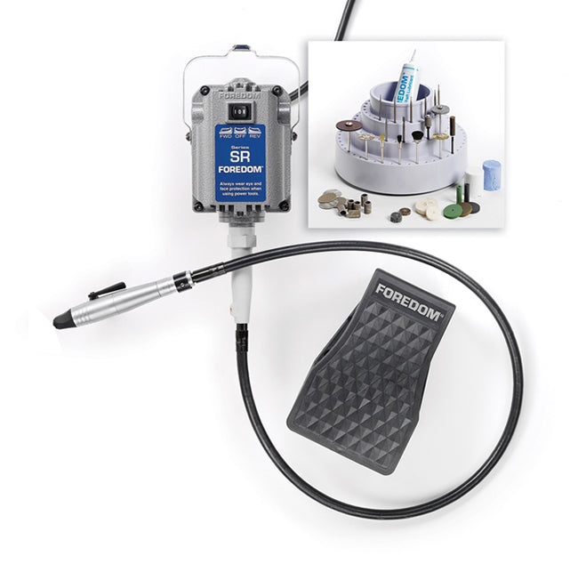 Includes: reversible SR 1/6 HP motor; FCT1 heavy duty plastic electronic foot control; FDM-20 quick-change handpiece; 54 accessories, including Trazact bands, Scotchbrite EXL wheels, MetalMaster wheels and rods, two compounds