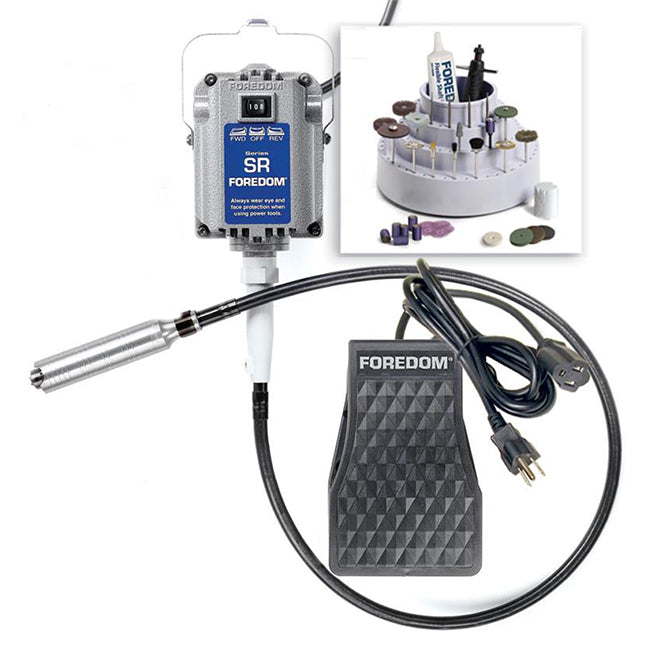 /6 HP (18,000 rpm) motor, FCT1 heavy duty plastic electronic foot control, FDM-30 handpiece with Jacobs chuck key and 54 accessories including Trazact bands, Scotchbrite EXL wheels, MetalMaster wheels and rods, CW wheels and two compounds. Two-year warranty