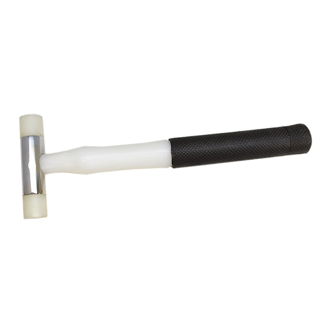 Double-sided nylon-faced hammer has a chrome plated base and comfortable rubber grip plastic handle. Easy screw-off faces are simple to replace.