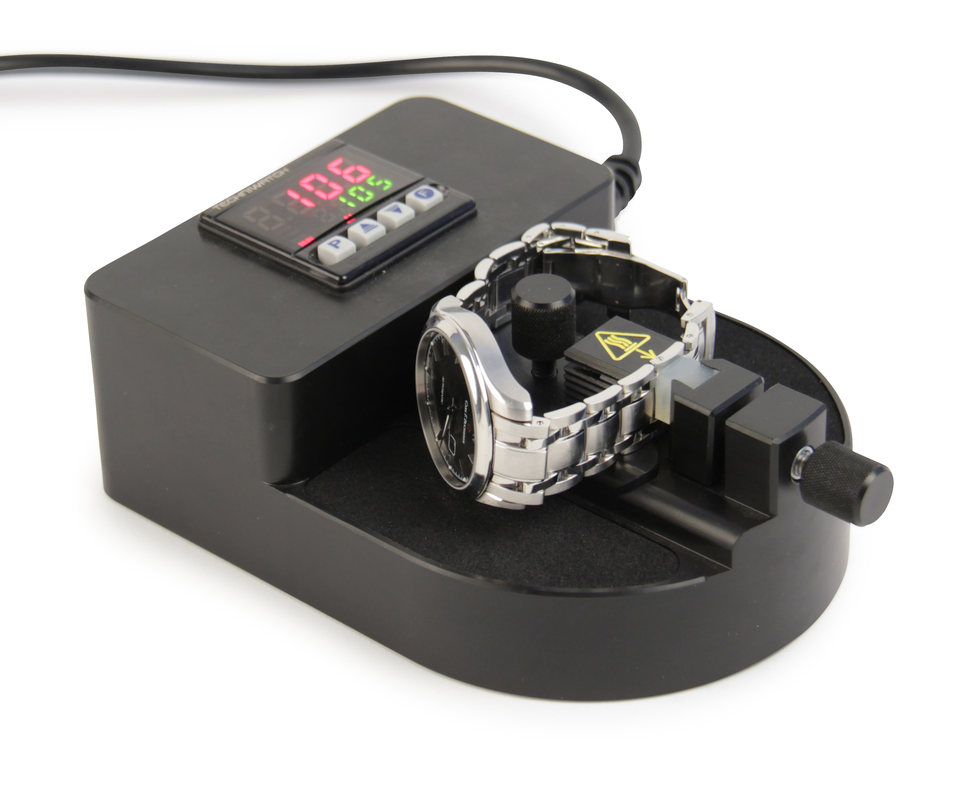 Heating vice makes it easier to unscrew watch bracelets in a boutique, risk-free. Enables you to turn watch band screws by softening the retaining liquid glue, allowing you to adjust the length of bracelets. In combination with cutting-edge sensor and heat transmission technology, the regulation electronics ensure exactly the right temperature is applied to a localized part of the bracelet.