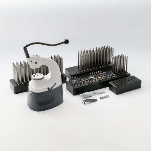 Star staking tool set includes 104 punches, 25 stakes, 12 pushers, 15 reamers, 6 pump pushers, 1 broach, and 2 pins. Micrometer adjustment that enables the punches to be fitted instead of the stakes.