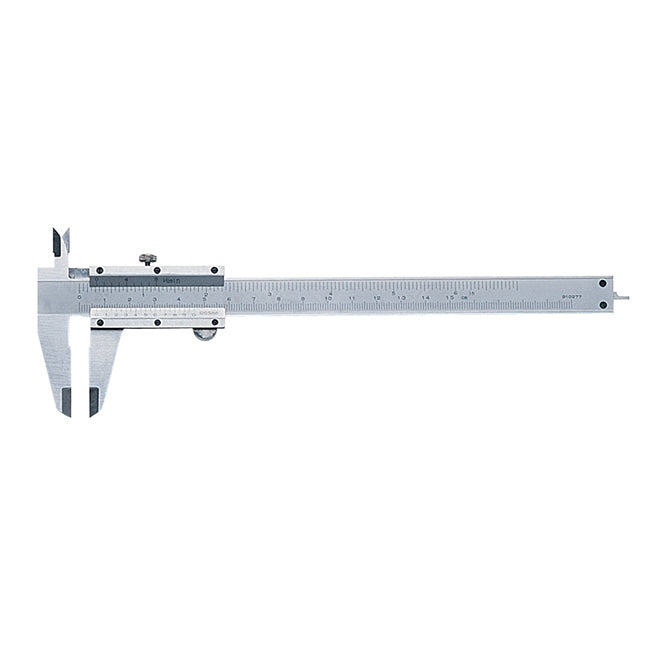 High-quality 6" Vernier caliper with finely honed jaws for exacting inside, outside, and depth measurements. Features inch and metric calibration, with accuracy to .008" and .05mm.