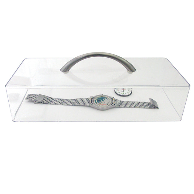 Handy, lightweight clear plastic cover to protect your open watches & movements from dust etc. overnight, while away, or waiting for parts. Overall size is 9.6" x 3.75" x 3.5" with Euro-style metal handle.
